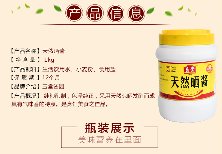 产品特色 采用先进发酵工艺,具有炒菜不粘锅的特性,不管烹煮炸炒,早放晚放,都不粘锅,且营养丰富,更易吸收,有烧肉颜色好,炒菜味道鲜的特色,特别适合家庭和餐饮使用。 公司名称: 山东玉堂酱园有限责任公司 公司地址: 济宁市任城区济邹路1号 服务热线: 400-6900-008 QQ: 416904816 邮箱: yutang300@126.com 网址: www.yutang.com.cn