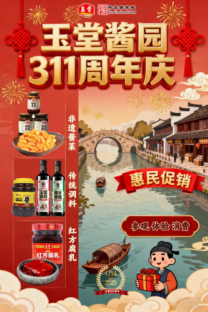 从1714年京杭大运河畔的三间酱菜铺,到如今载誉无数的中华老字号,玉堂酱园携三百年风华如约而至,311周年庆暨惠民促销活动即将在11月7日开启。这份跨越三个世纪的匠心味道,将以最实在的福利回馈每一位顾客的厚爱 。