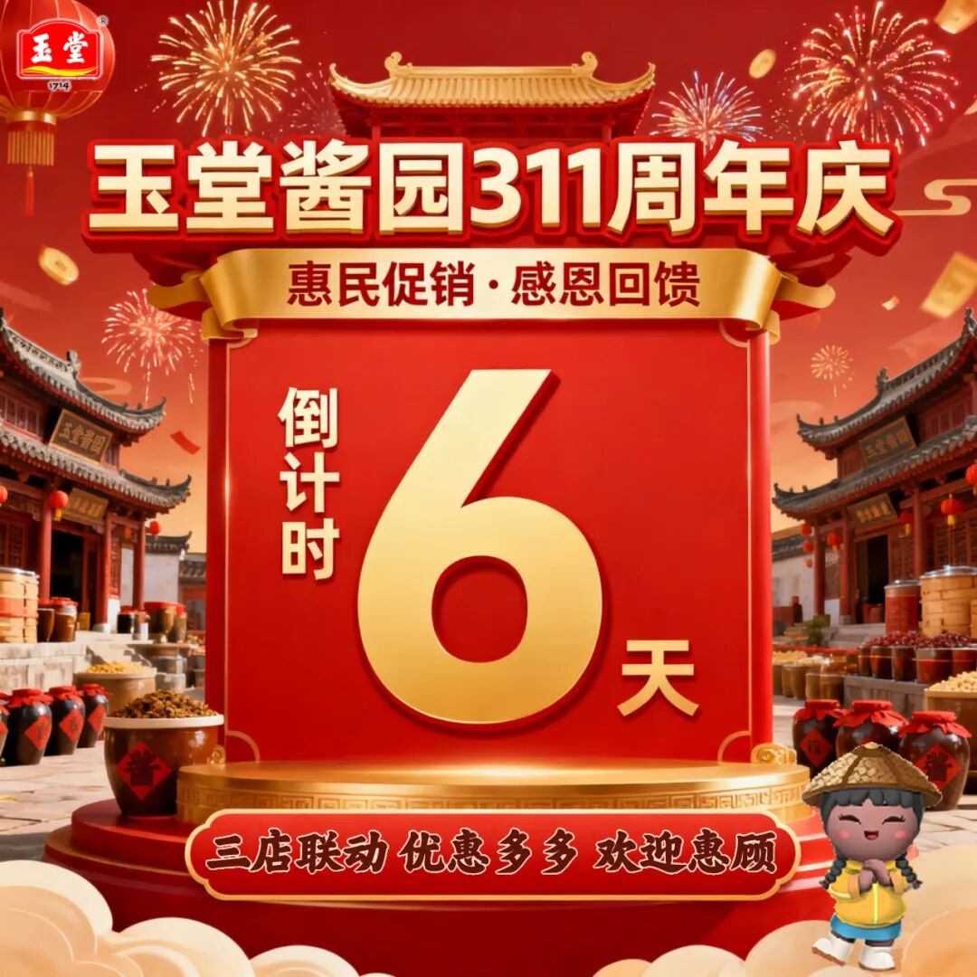 还有6天!承载三百年匠心的玉堂酱园311周年庆暨惠民促销活动即将开启,跨越三个世纪的中华老字号品牌惠民礼献全城!